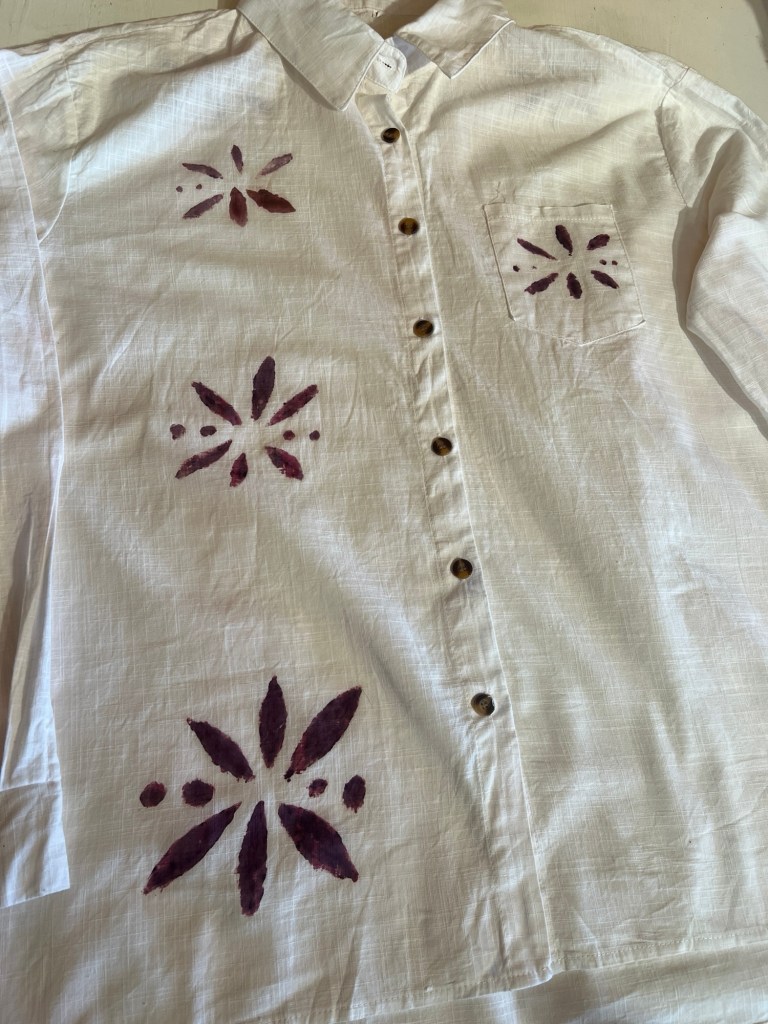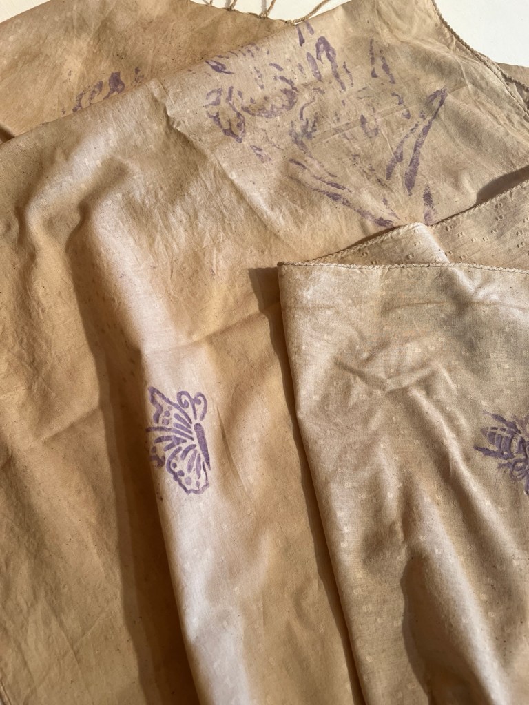 2025 natural dyes madder on cotton Oatmeal resistant Butterflies in Dandelions Flight of the Bumblebee water lilies