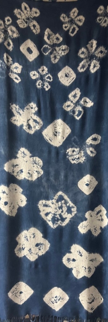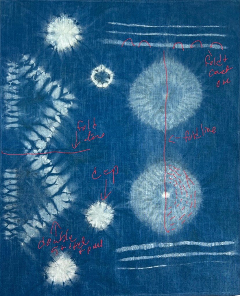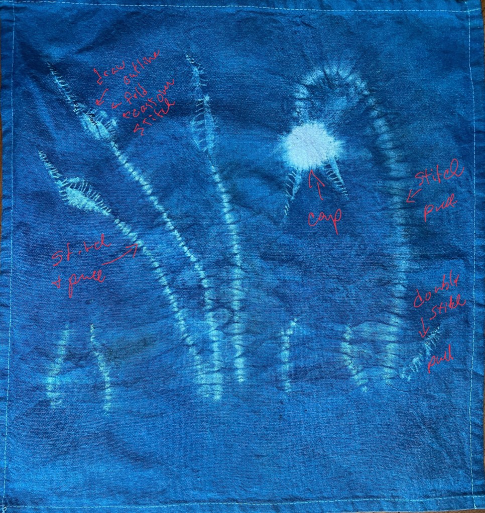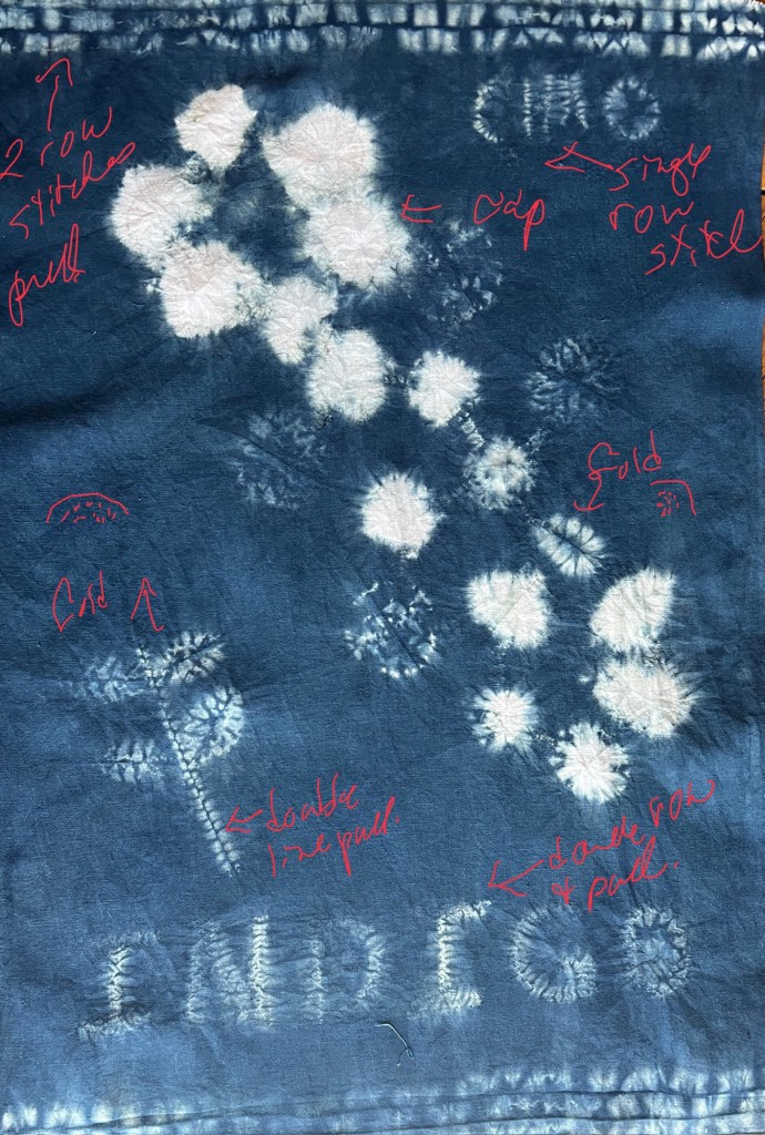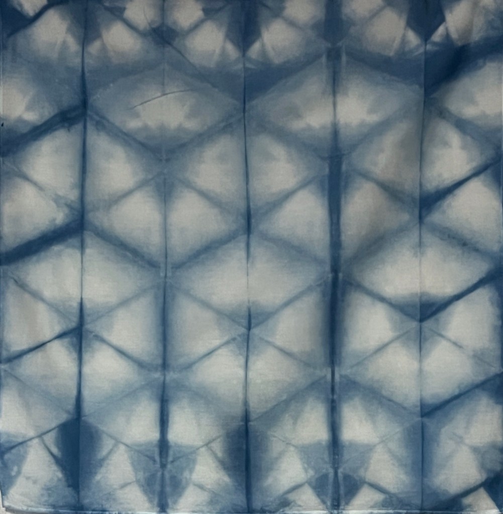 my resists combination.. pulled stitches wrapped and elastic bands on pulled stitch clamp. resists-no soak-triangle center fold -clamp resist