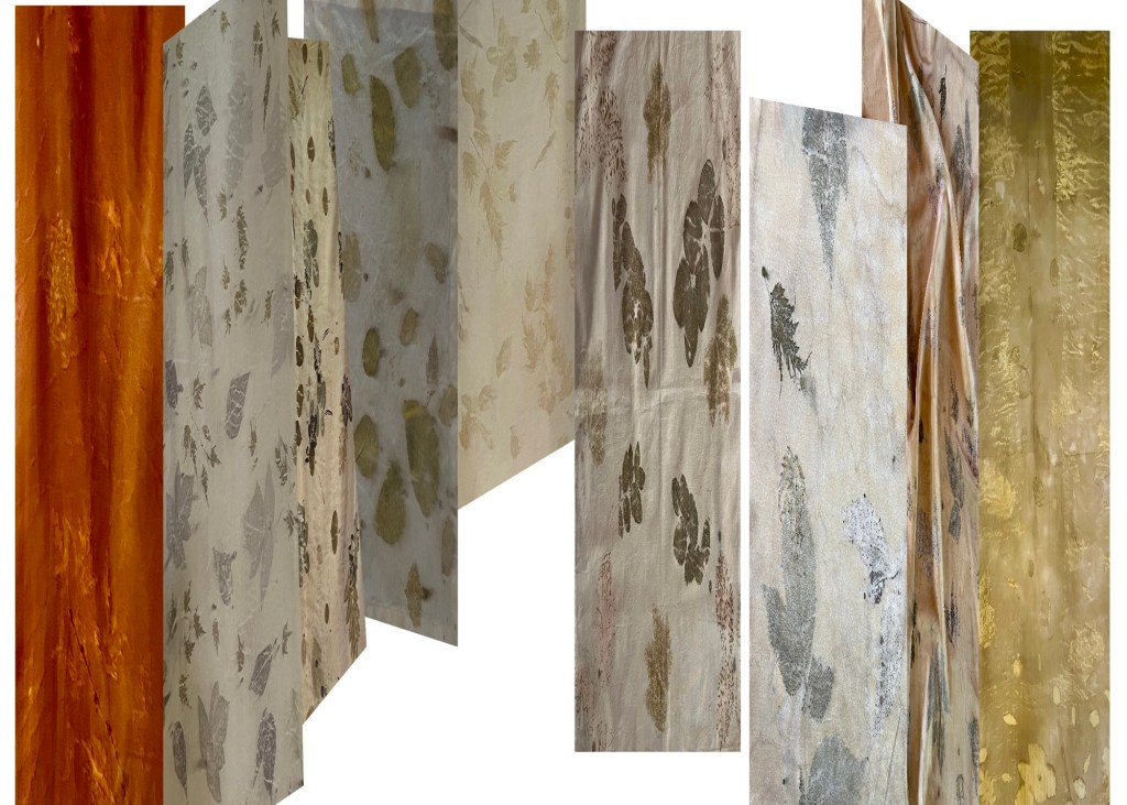 In proposal stress this is memores of my walks in my forest produced in my studio with dyes I. have made from plants on my acreage and leaves/flowers/grasses roots from my acreage.