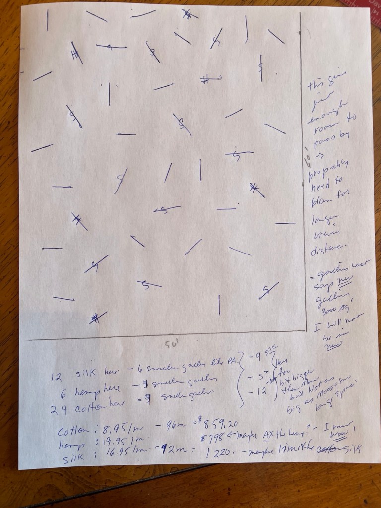I. Could Put the hemp towards the middle , then plan for cotton , then silk like in layers of the trail as one sees coming down the hill or I could just blend.. I will need to make a scale drawing to see how many panels required, thus how. much material required…