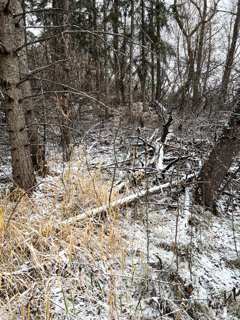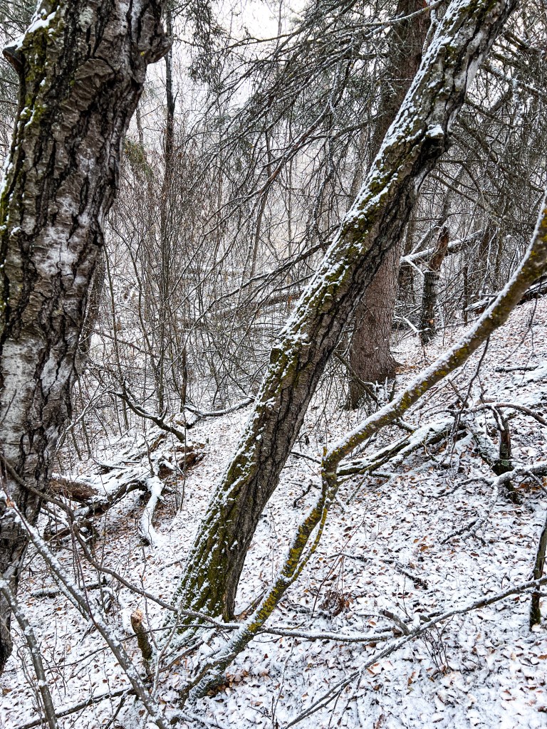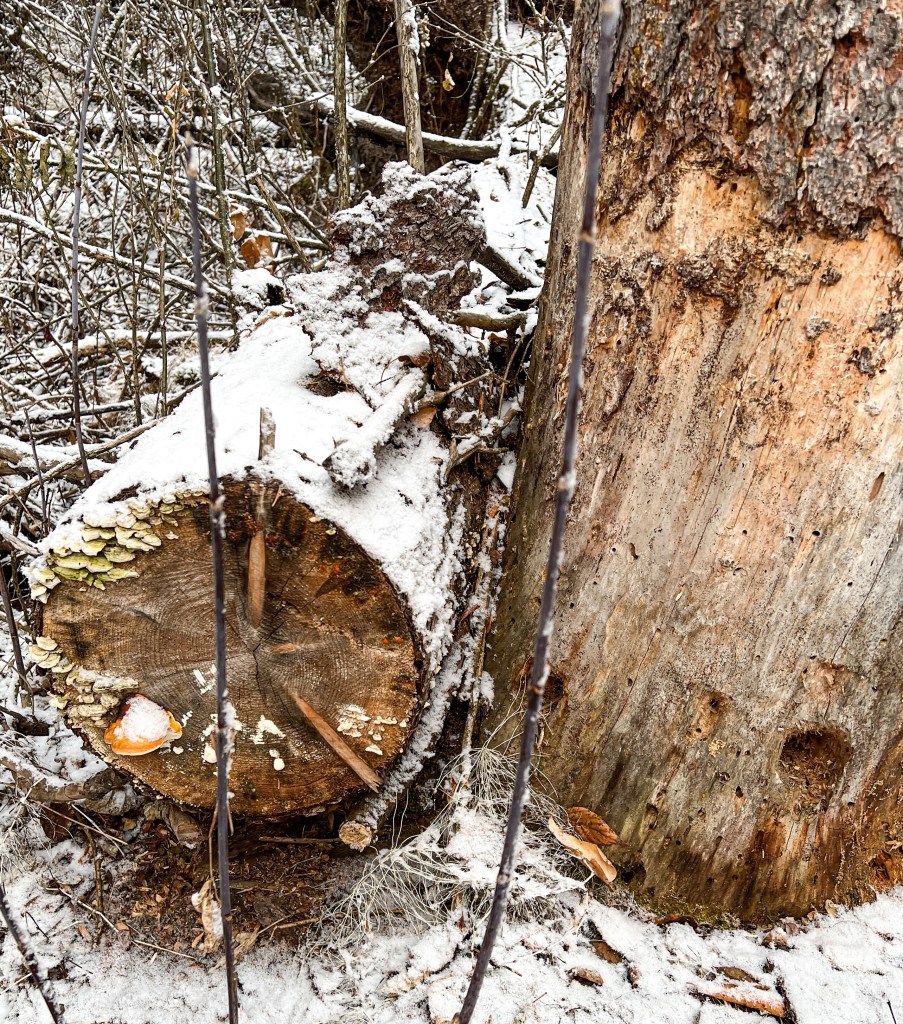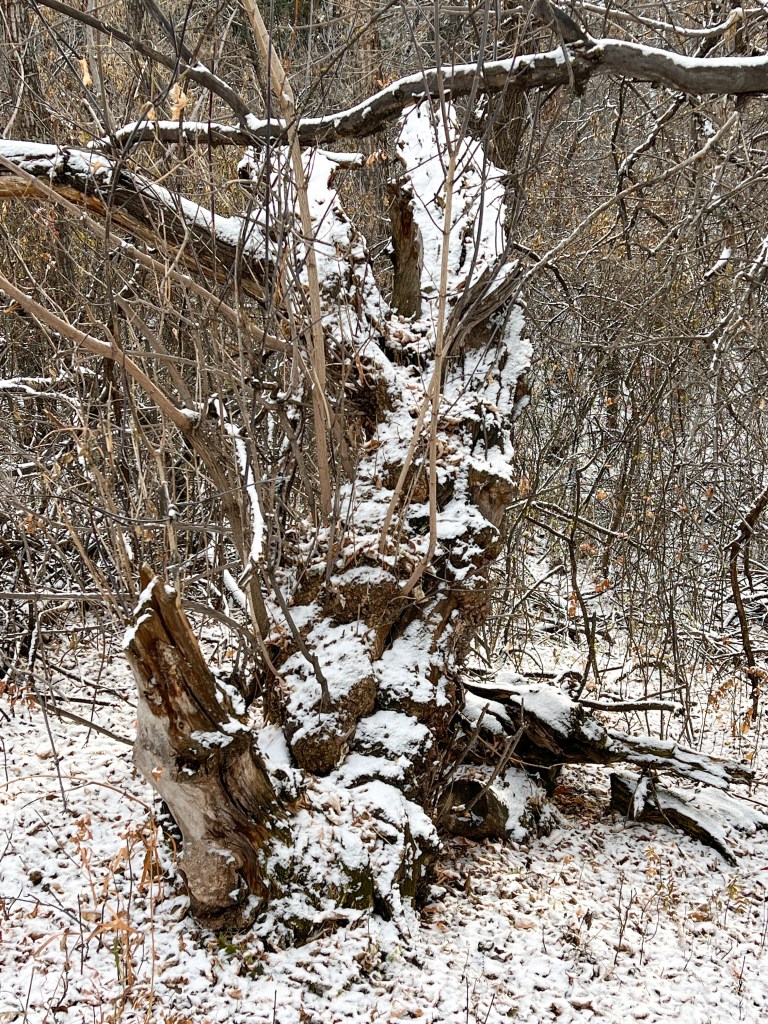 Tree-Trail first fall dusting fall 0ct 2023 up the slope bottom of hill food for new growth a a bit of colour left further along trail squirrel home peek at horizon a bit of colour loss of lmb the fox has been though nov 8 ice & snow early November along the creek enhanced along the creek nov 8