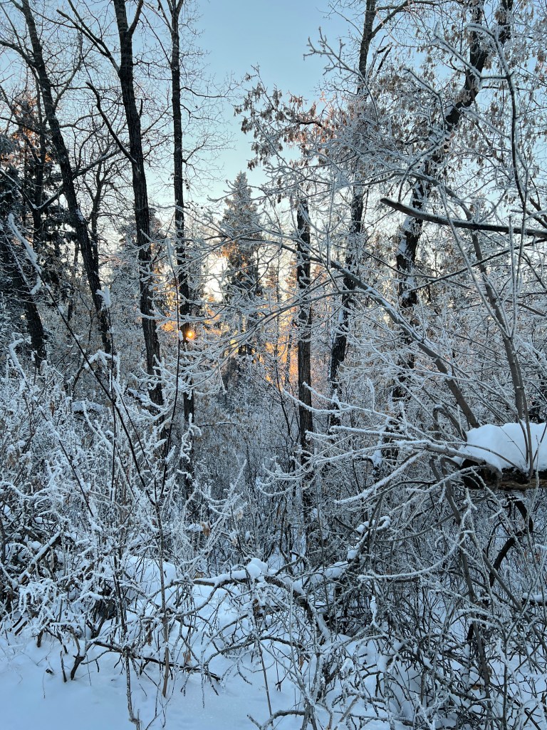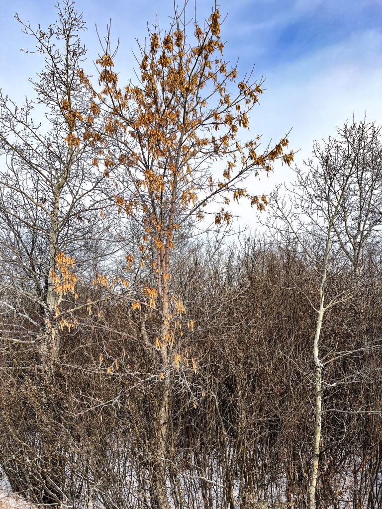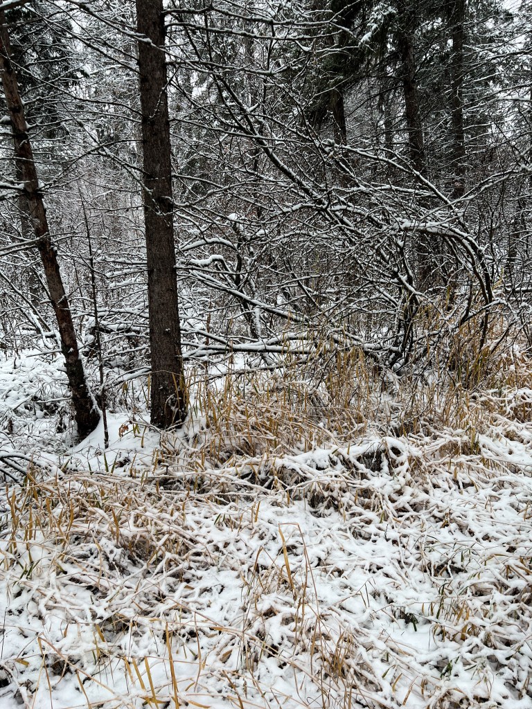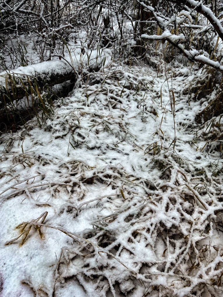 Tree-Trail first fall dusting fall 0ct 2023 up the slope bottom of hill food for new growth a a bit of colour left further along trail squirrel home peek at horizon a bit of colour loss of lmb the fox has been though nov 8 ice & snow early November along the creek enhanced along the creek nov 8